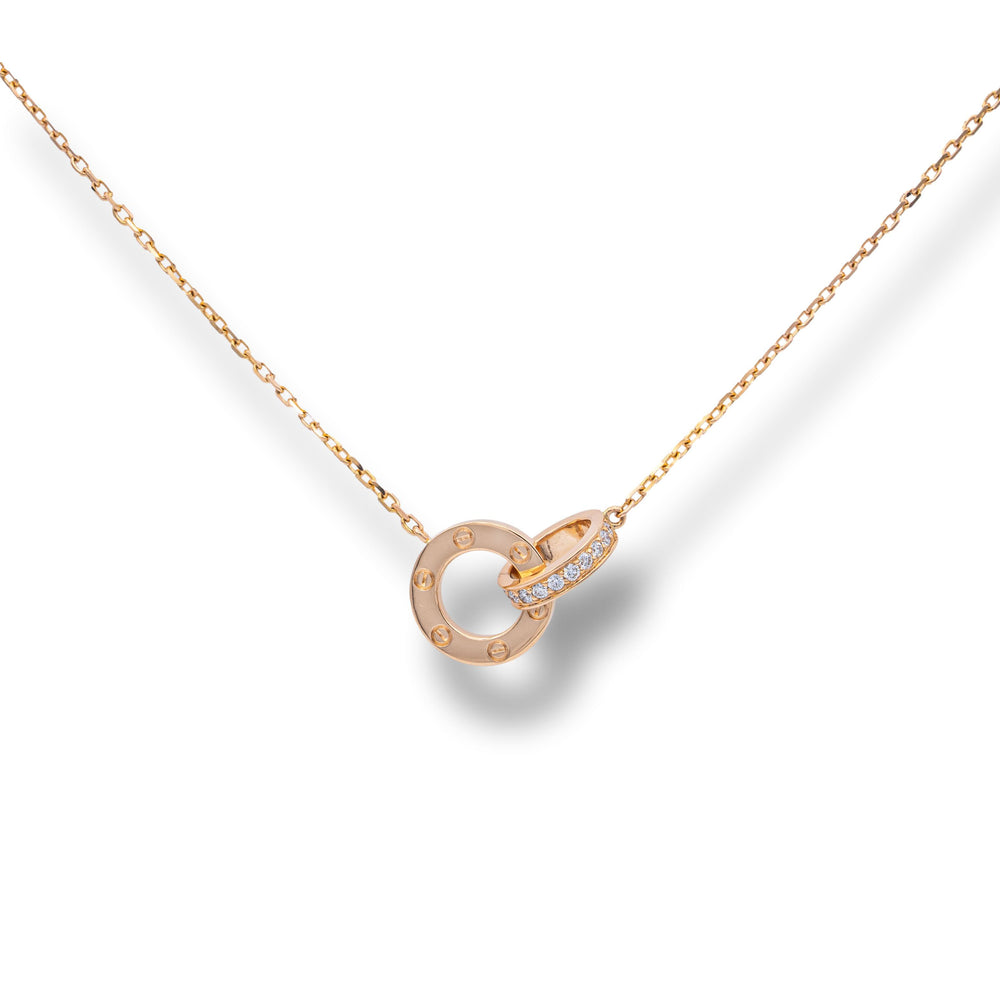 Cartier double ring necklace from the LOVE collection finely crafted in 18 karat rose gold with 48 round brilliant cut diamonds weighing 0.30 cts total. Necklace has an adjustable chain for lengths 14"-16". Lobster claw closure. Fully Hallmarked.
