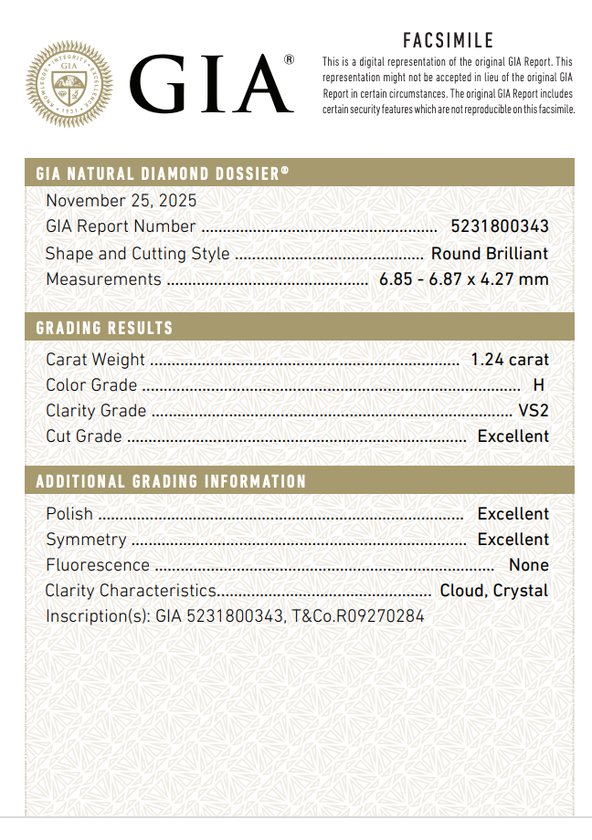 Coming Soon- Tiffany & Co. Platinum 1.24 ct H VS2 Round Diamond Solitaire Engagement Ring