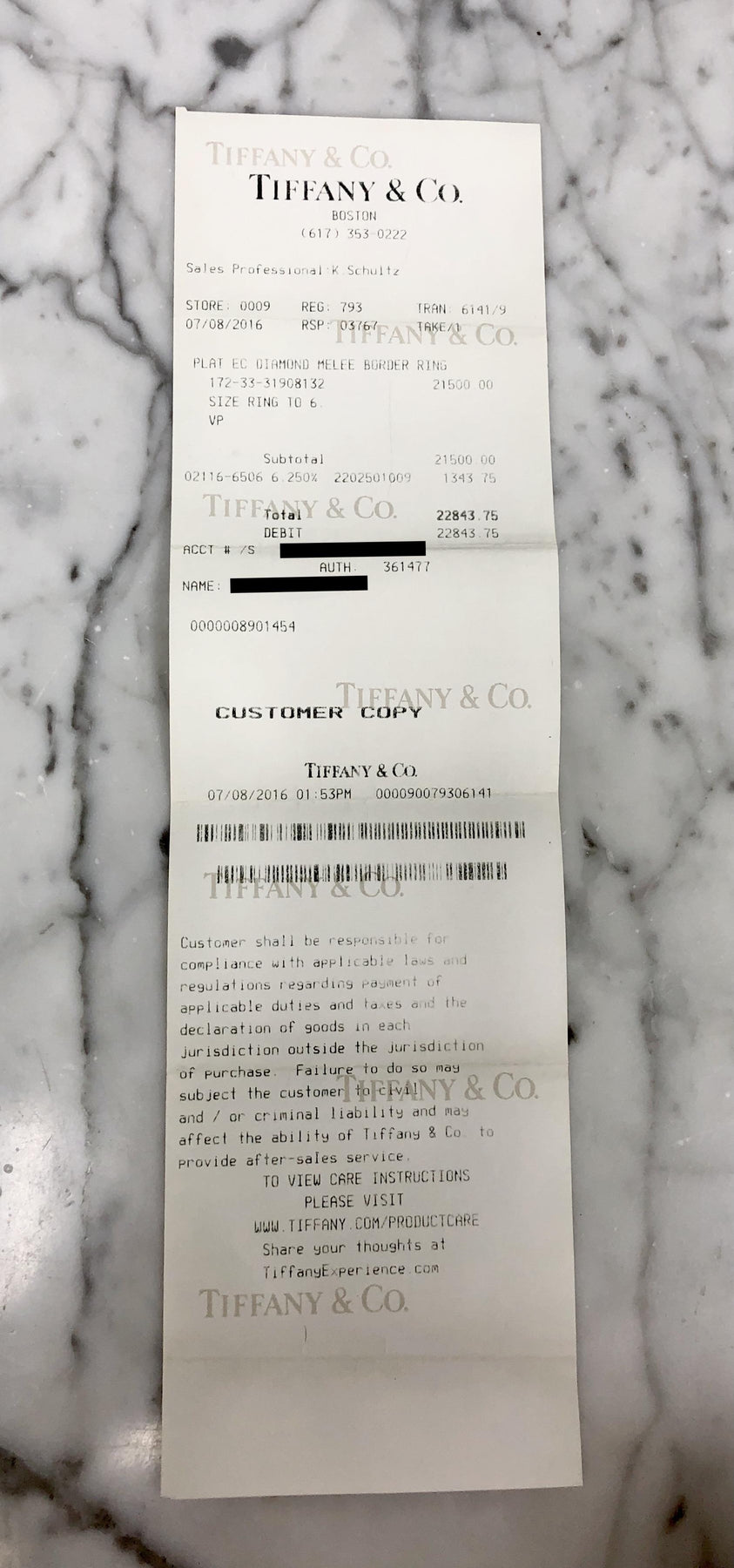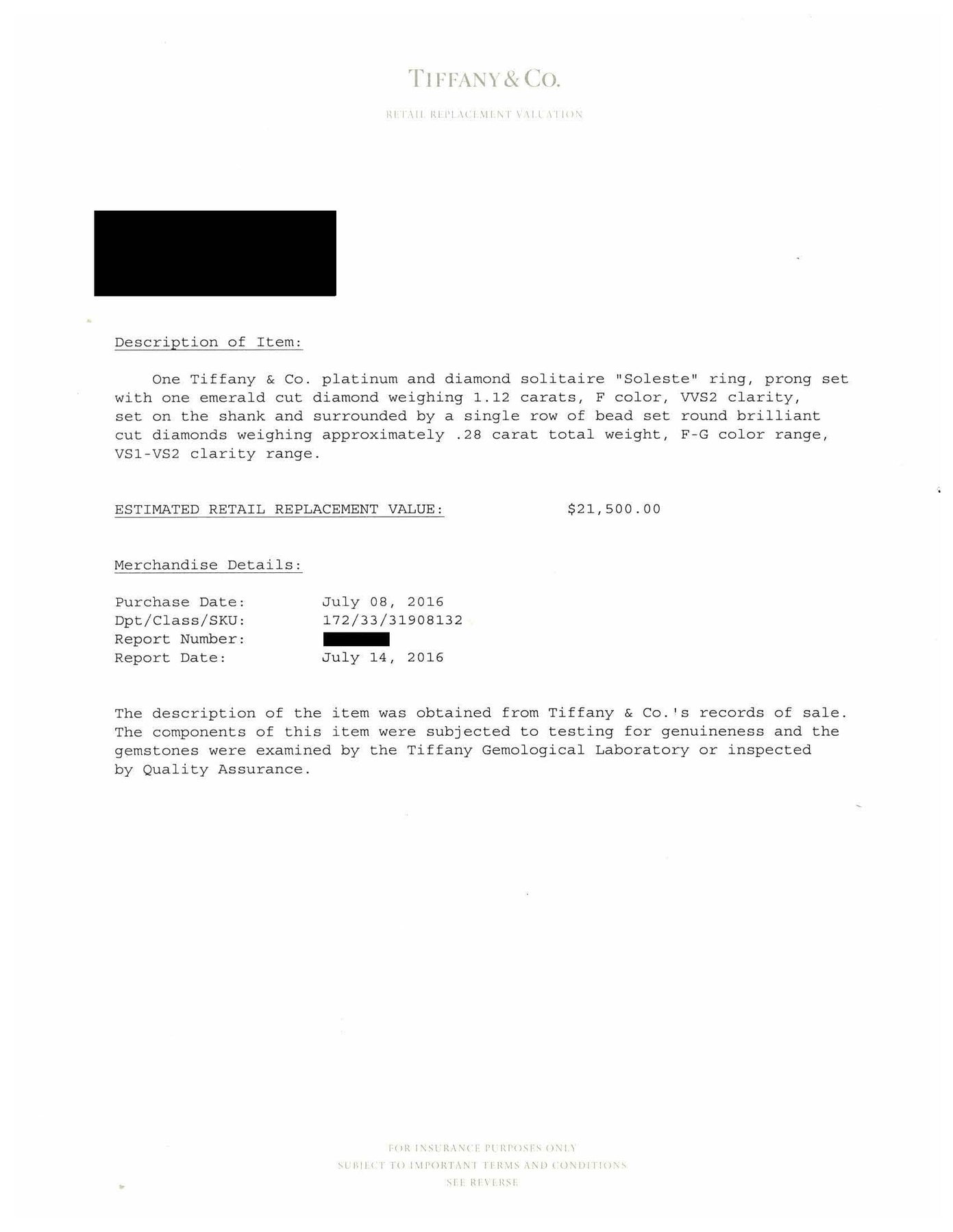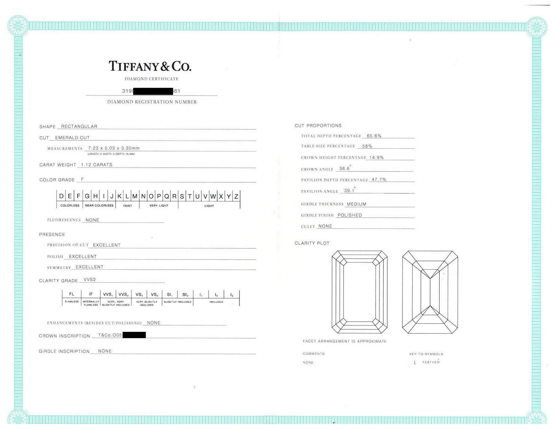 - Hallmarks: © Tiffany & Co., PT950, D 1.12 ct, Serial Number
