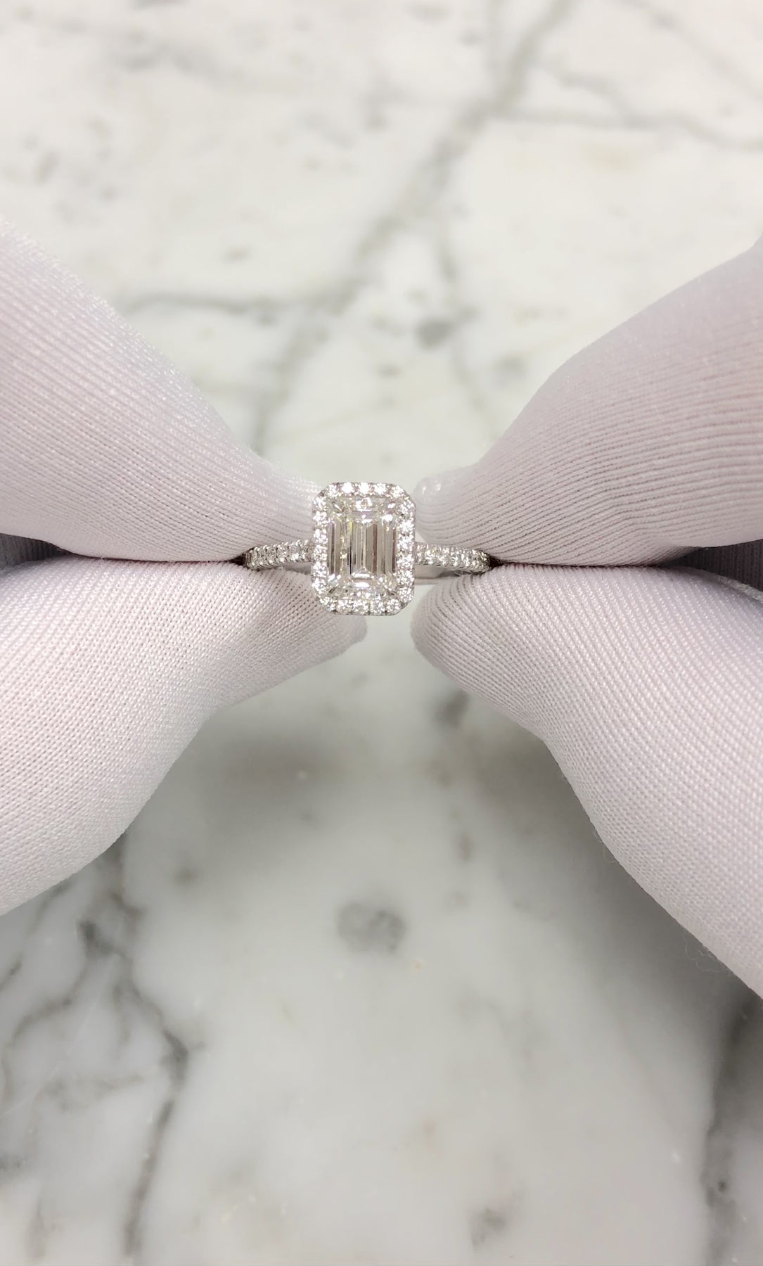 Tiffany & Co. Soleste 1.12 Ct Center Emerald Cut Halo Engagement Ring - F VVS2