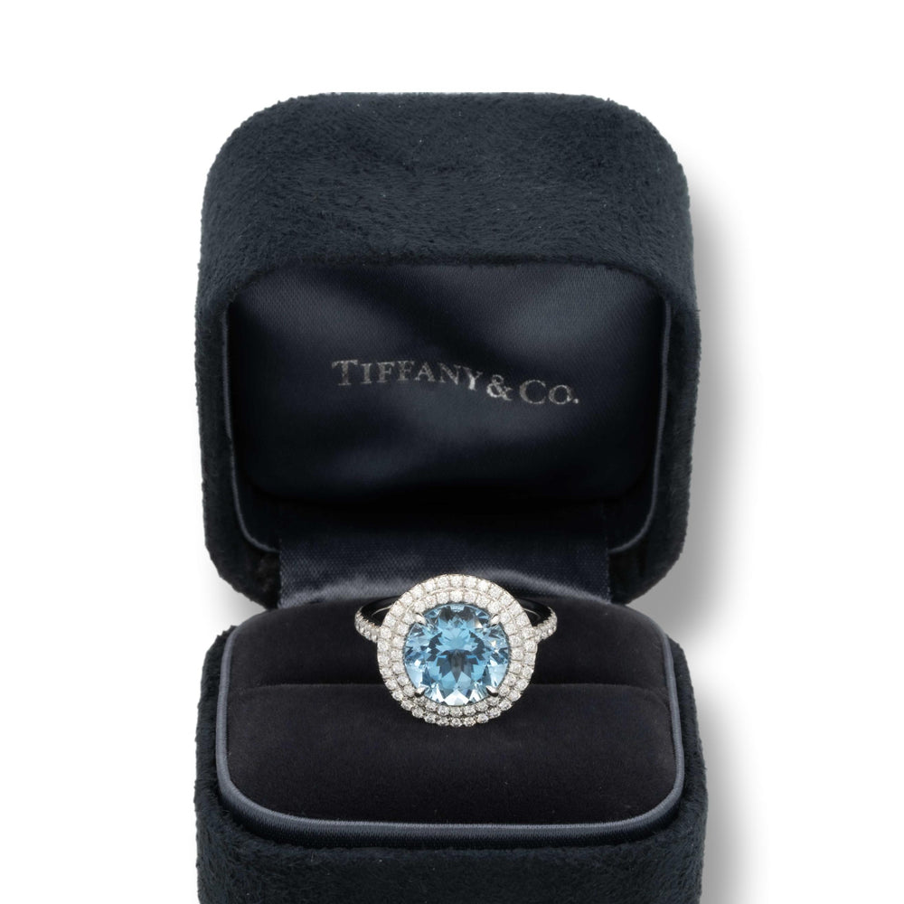Tiffany & Co. double Soleste aquamarine and diamond ring finely crafted in platinum with a round brilliant cut deep blue color aquamarine weighing 5.00 carats approximately , surrounded by a double row of round brilliant cut bead set diamonds weighing 0.51 carats total weight approximately.
