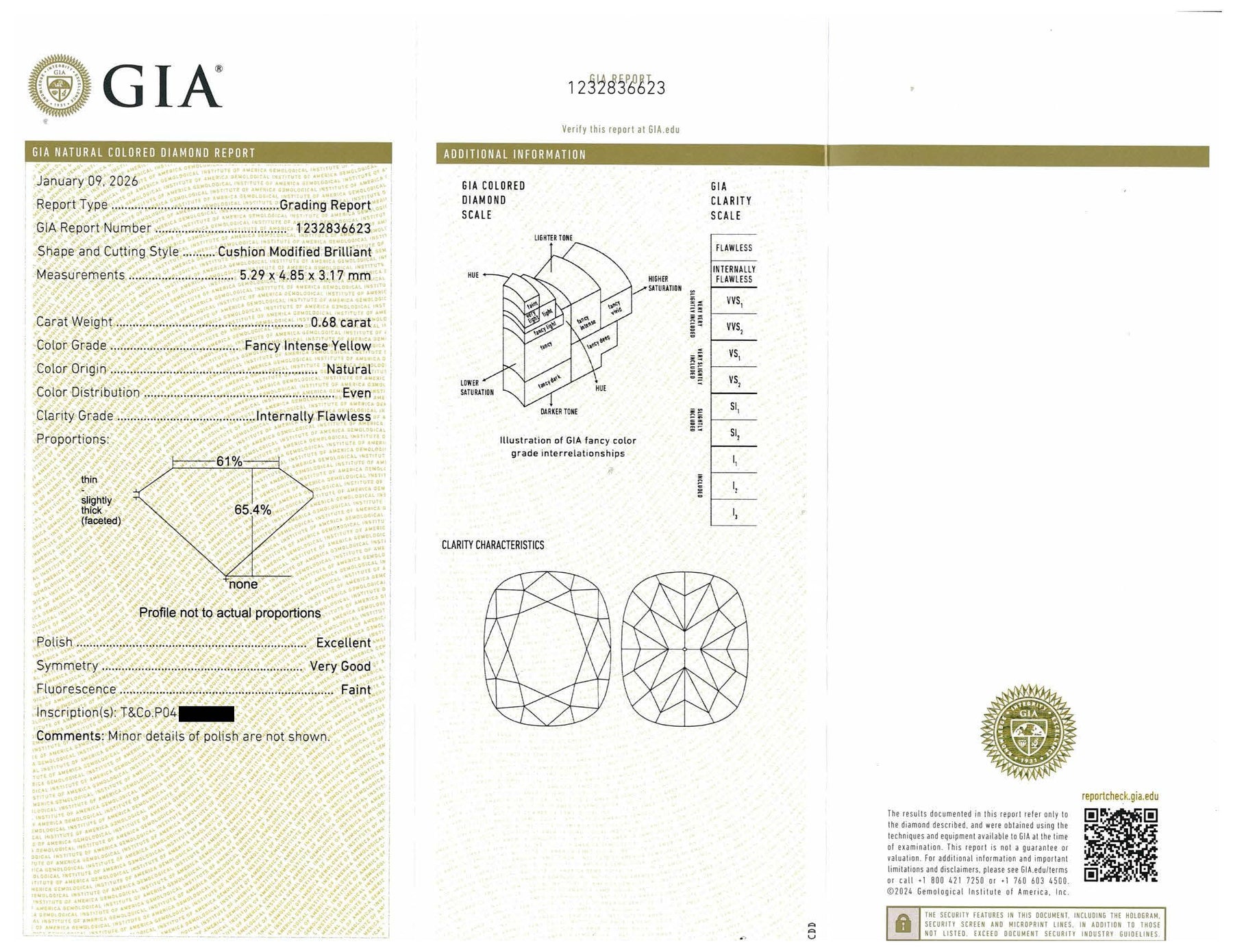 - Center Color / Clarity: Fancy Intense Yellow / Internally Flawless
