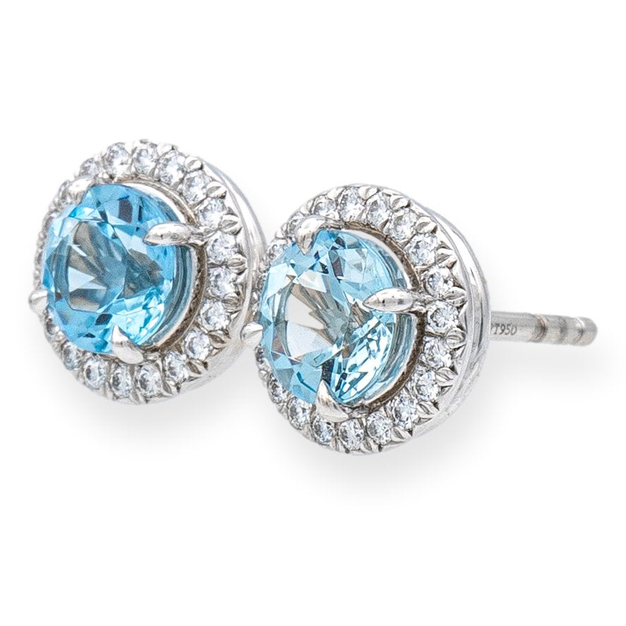 Tiffany & Co. stud earrings from the Soleste collection finely crafted in platinum featuring two round aquamarine centers measuring 6mm each surrounded by a halo of round brilliant bead set cut diamonds weighing 0.40 carats total weight approximately. Friction back posts with "La Poussette" backs with a side press mechanism lock for extra safety. Fully hallmarked with logo and metal content.