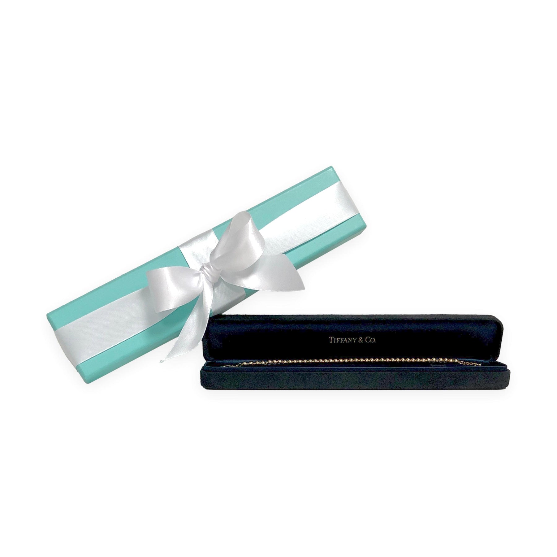 - Tiffany & Co. Faux leather Blue bracelet box, with white satin ribbon