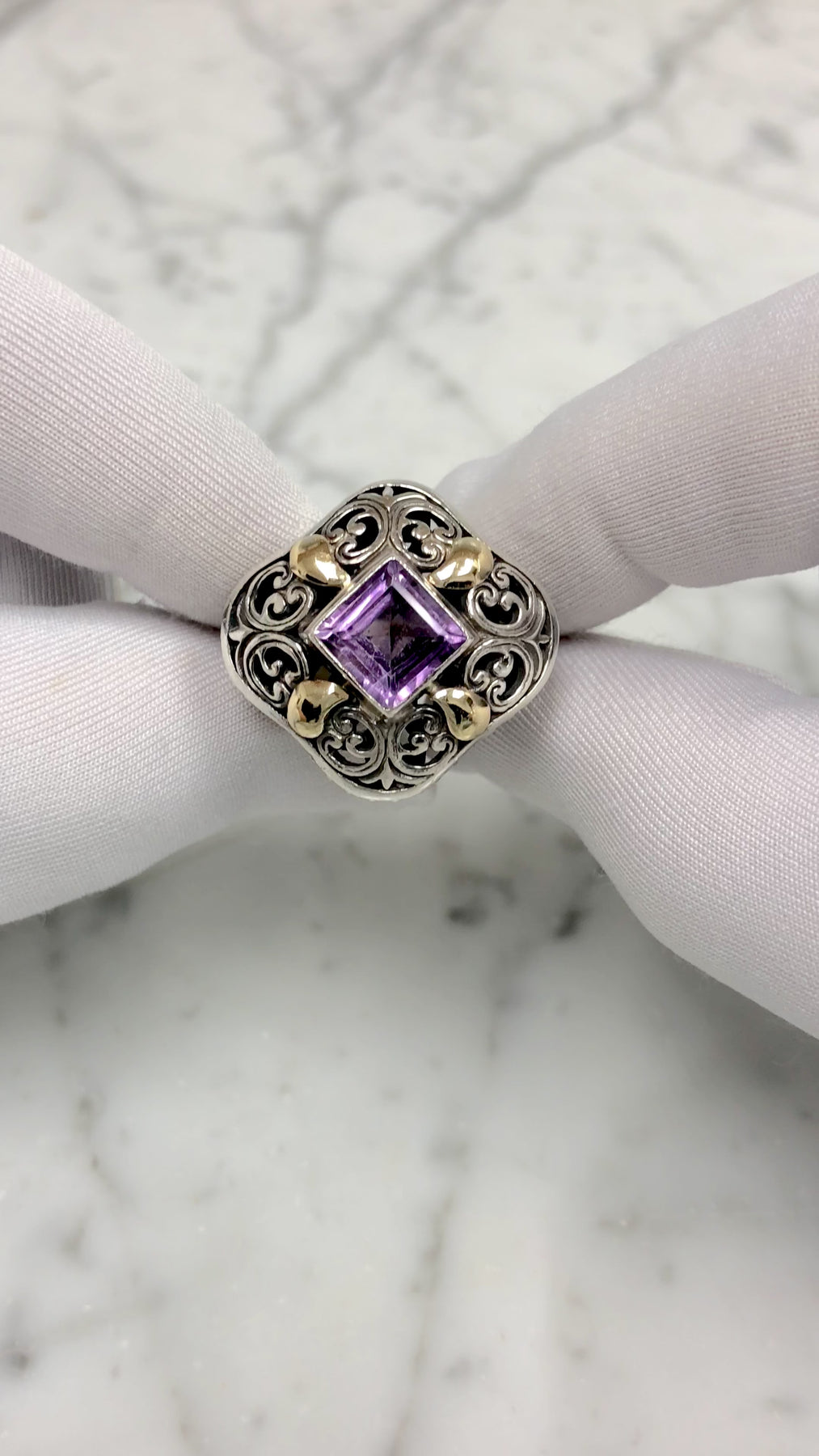 Vintage 18K Gold and Sterling Silver Amethyst Open-Scroll Work Cocktail Ring