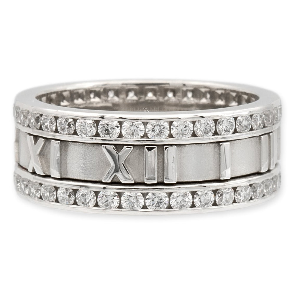 Vintage Tiffany & Co. band ring from the Atlas collection finely crafted in 18 karat white gold featuring 2 rows of round brilliant cut diamonds weighing 1.53 carats total weight G-H color and VVS-VS clarity range. The center features roman numerals all the way around in a satin finish. Made in the year 2000. Band measures 8.5 mm wide. Fully hallmarked with logo and metal content.